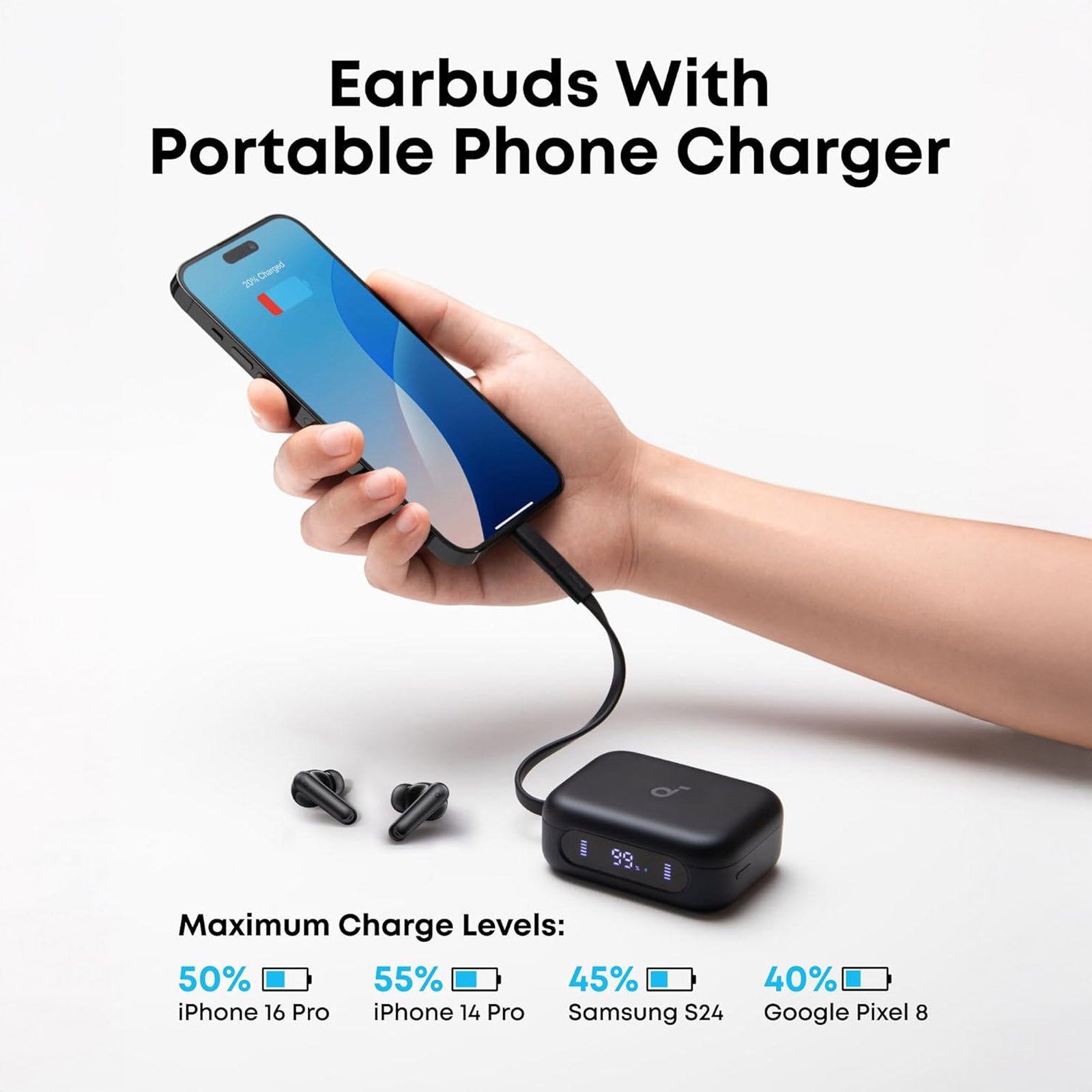 Portable Phone Charging: The case charges iPhone 16 Pro to 50% or Samsung S24 to 45% with 10W and 3,000mAh power.