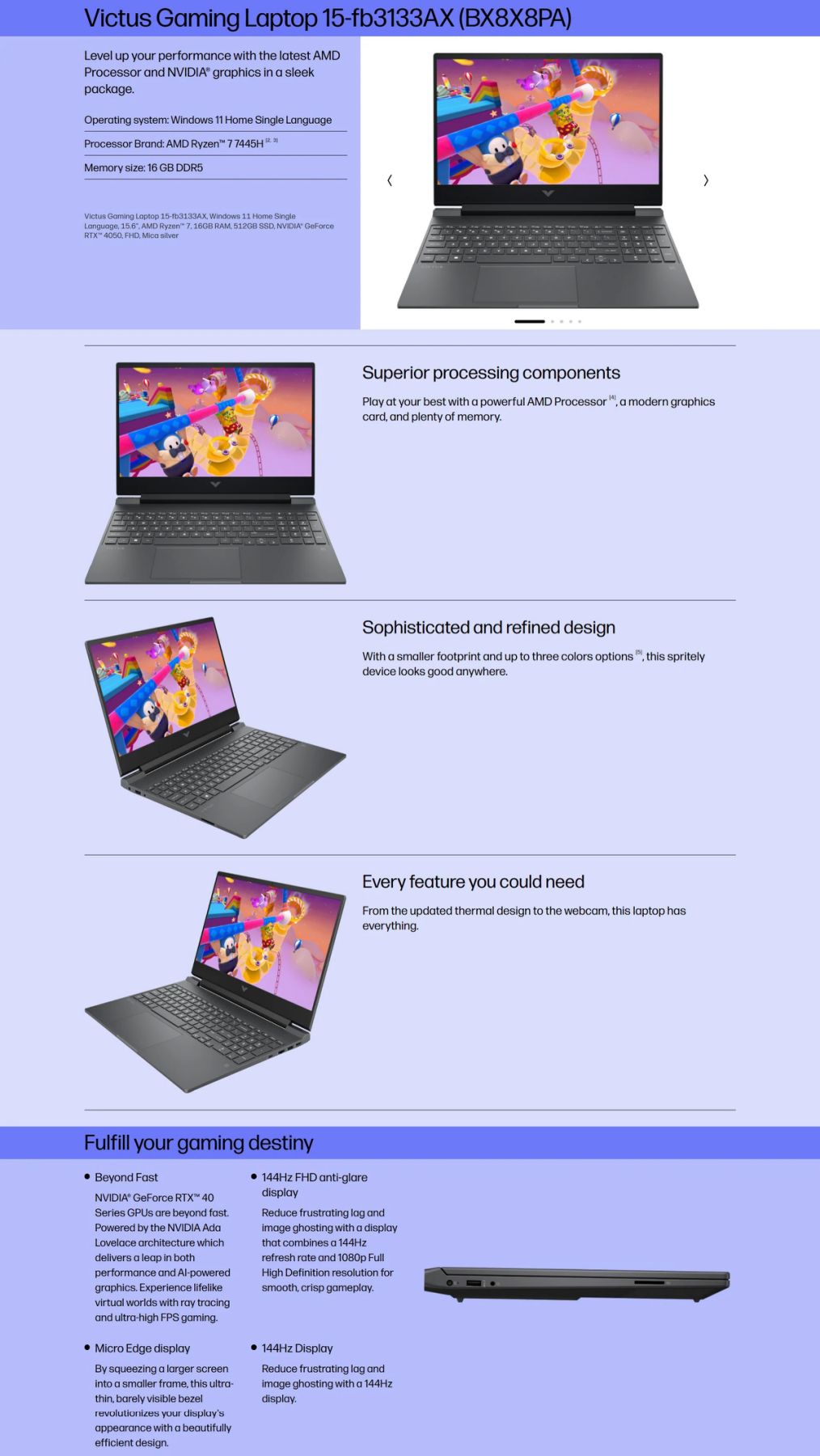 HP VICTUS 15-FB3133AX/ RYZEN 7 7445HS/ 16GB DDR5 5600/ 512GB SSD/ 15.6 FHD IPS 144HZ/ WIN 11/ RTX4050 6GB/ OFFICE H&S 2024 + M365/ SILVER